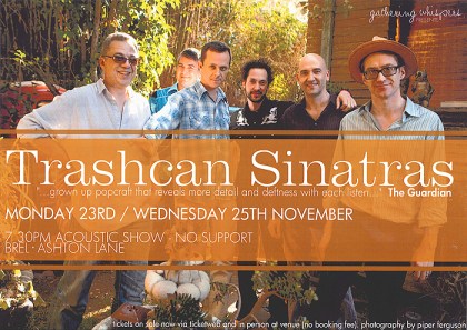 Following their 5 star Oran Mor, Glasgow and Cabaret Voltaire, Edinburgh gigs, the Trashcans announced 2 intimate acoustic shows for Monday 23 and Wednesday 25 November 2009 in the conservatory of Glasgow’s Brel Bar – the venue where they played a series of never to be forgotten concerts in 2003.