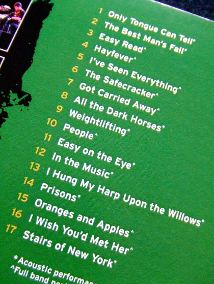 The CD comes in a simple cardboard sleeve and includes at least one song from each of the band’s 5 studio albums, with the tracks split between acoustic and full band.