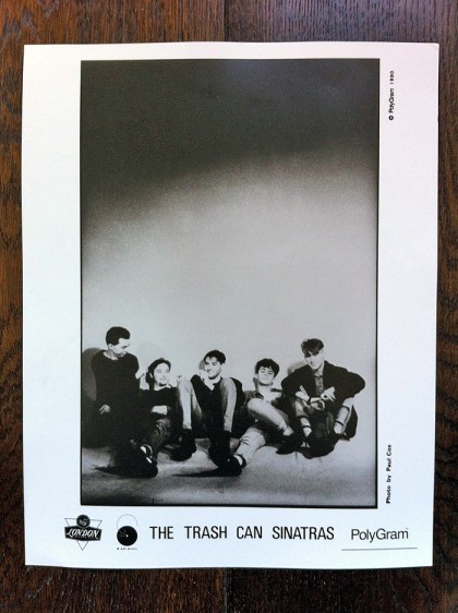 US 8″ x 10″ promotional black & white publicity photograph featuring a great image of an early Trashcan Sinatras line-up: (Left to right; John Douglas, George McDaid, Paul Livingston, Stephen Douglas and Frank Reader).